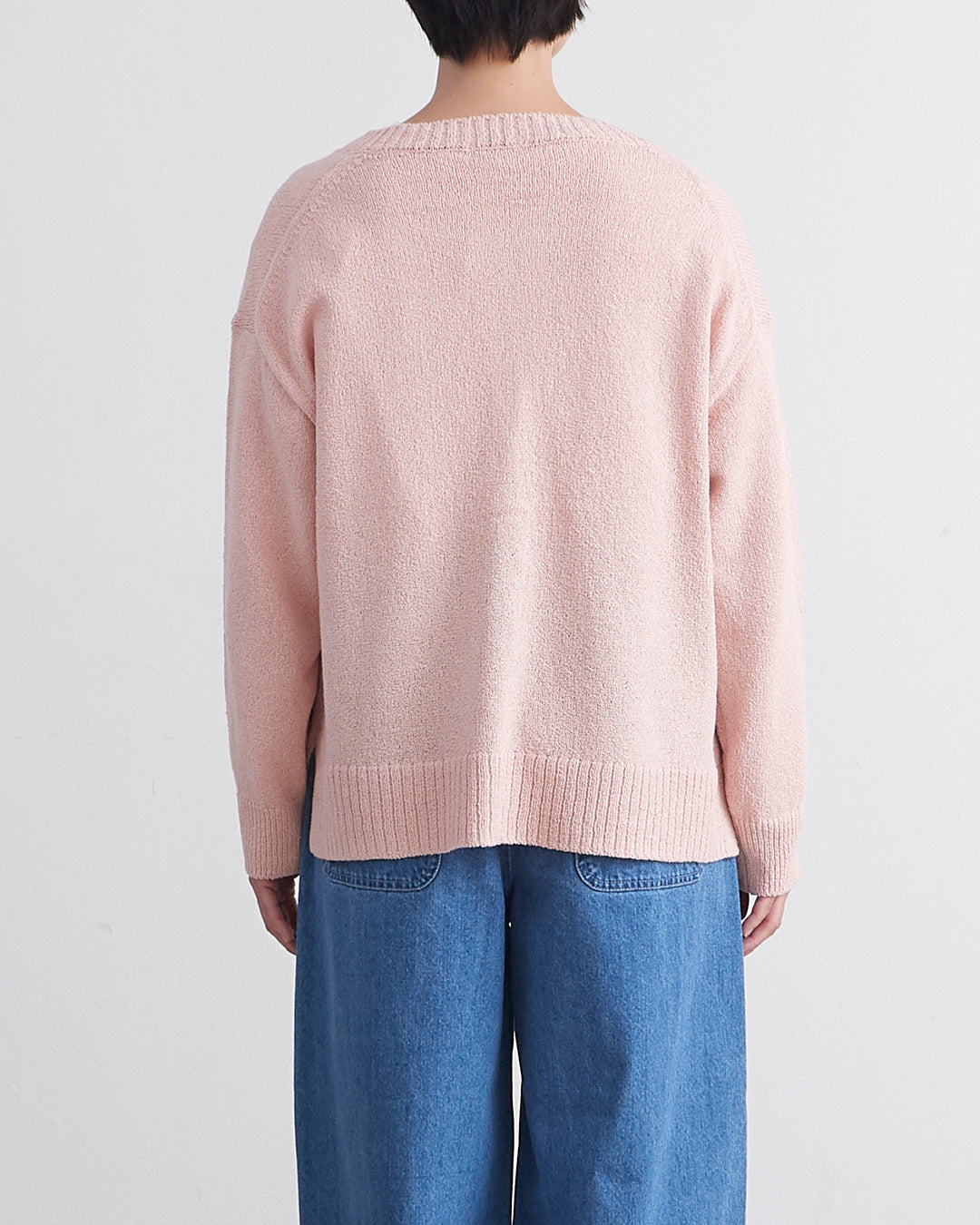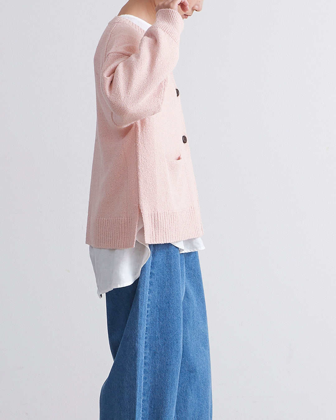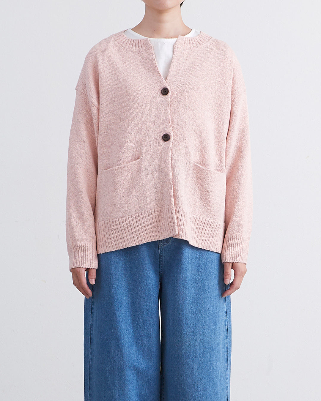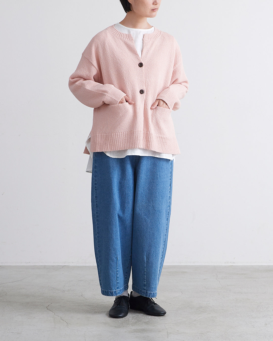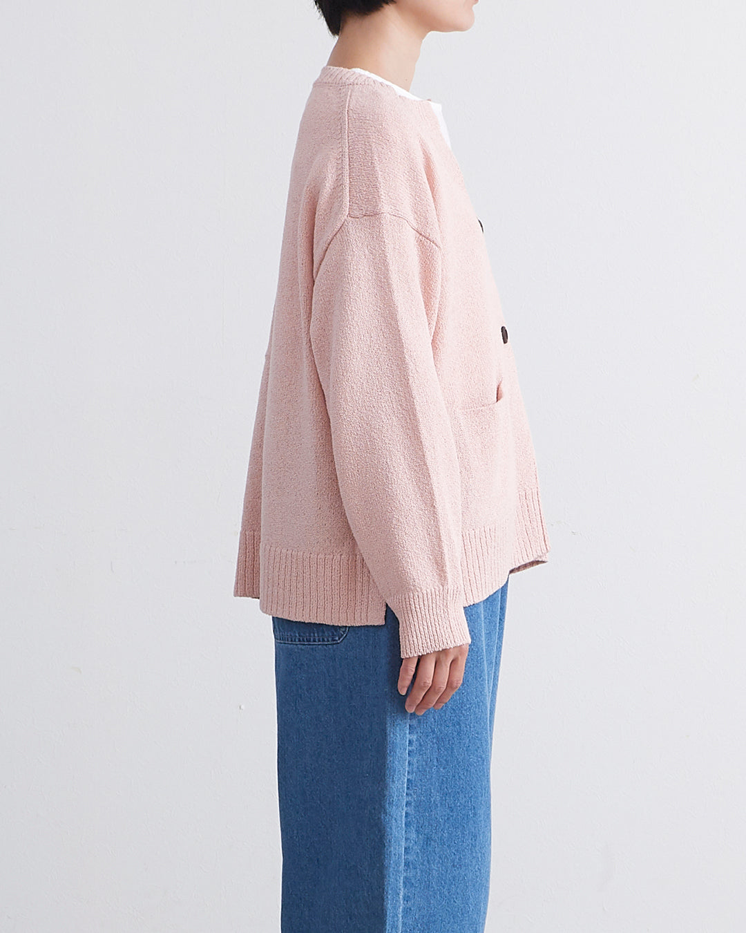 編地に表情のあるショートブークレ糸を使用したカーディガンです 。フロントのウッドボタンがナチュラルなアクセントを添えます 。2ボタン仕様でサッと羽織るだけでこなれ感のあるスタイルが完成 。衿の開きやサイドスリットが抜け感を出し、便利なフロントポケットも付いた実用的な一着です 。