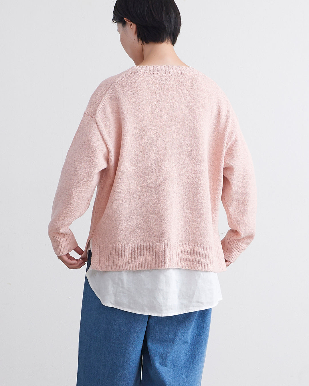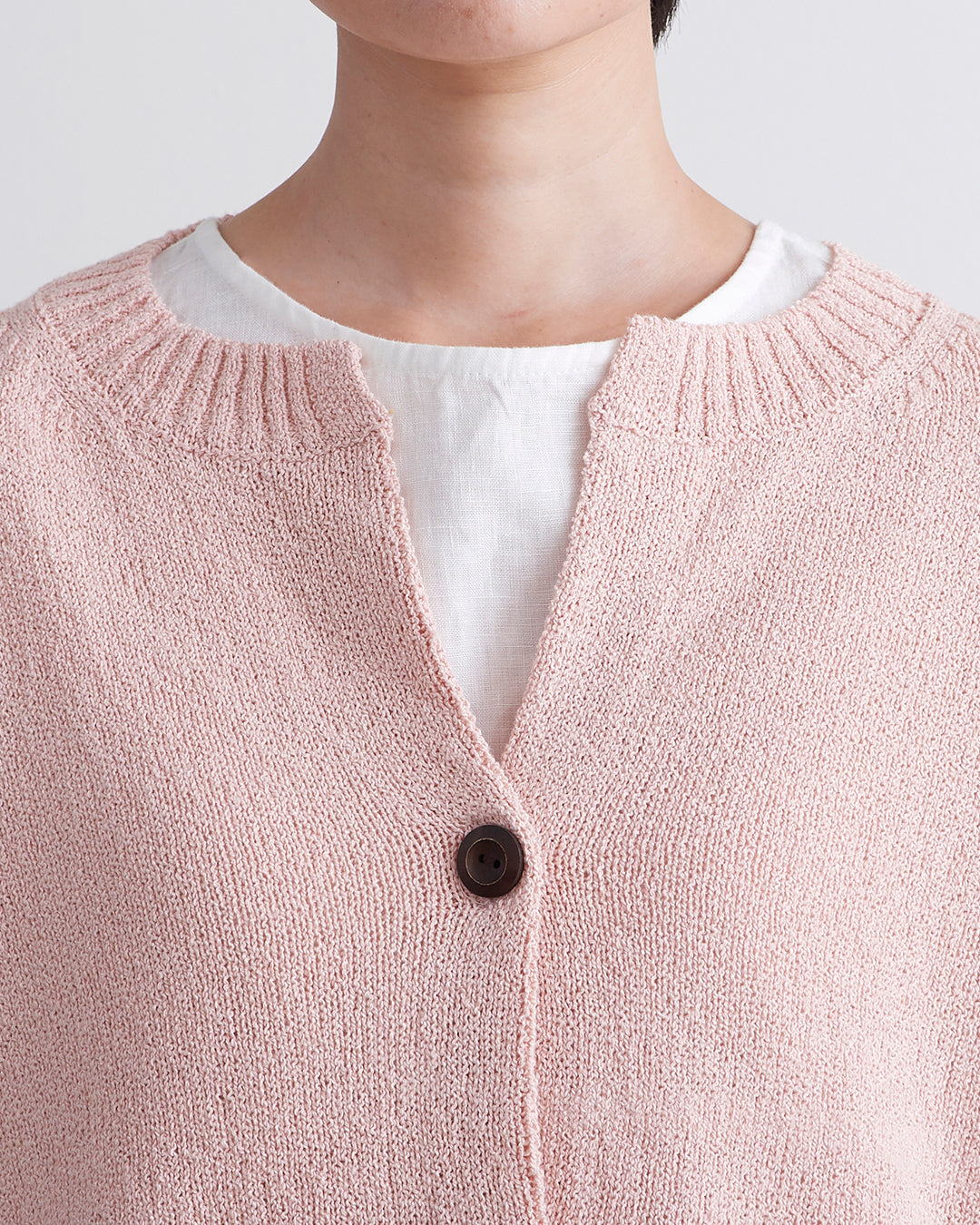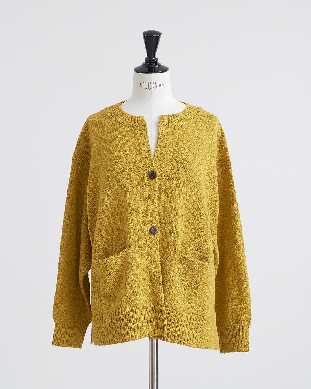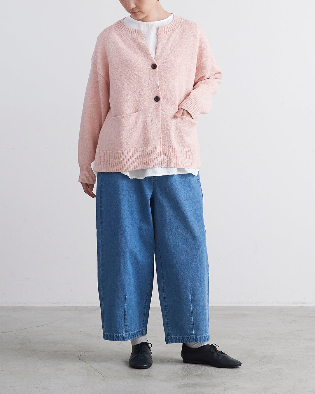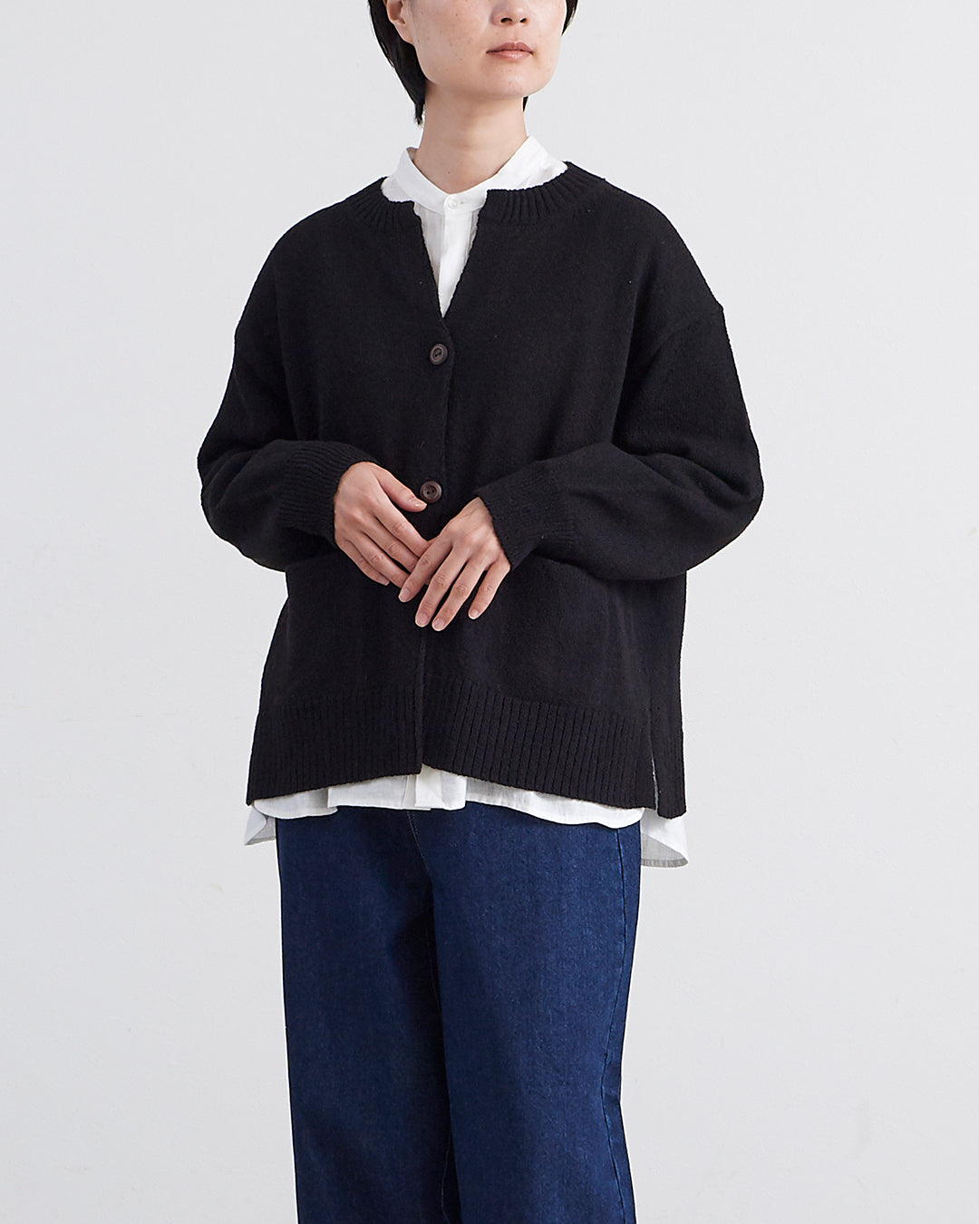 編地に表情のあるショートブークレ糸を使用したカーディガンです 。フロントのウッドボタンがナチュラルなアクセントを添えます 。2ボタン仕様でサッと羽織るだけでこなれ感のあるスタイルが完成 。衿の開きやサイドスリットが抜け感を出し、便利なフロントポケットも付いた実用的な一着です 。