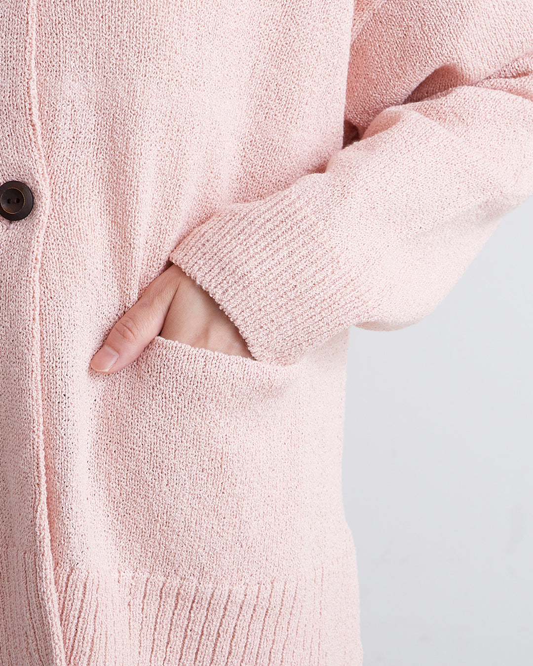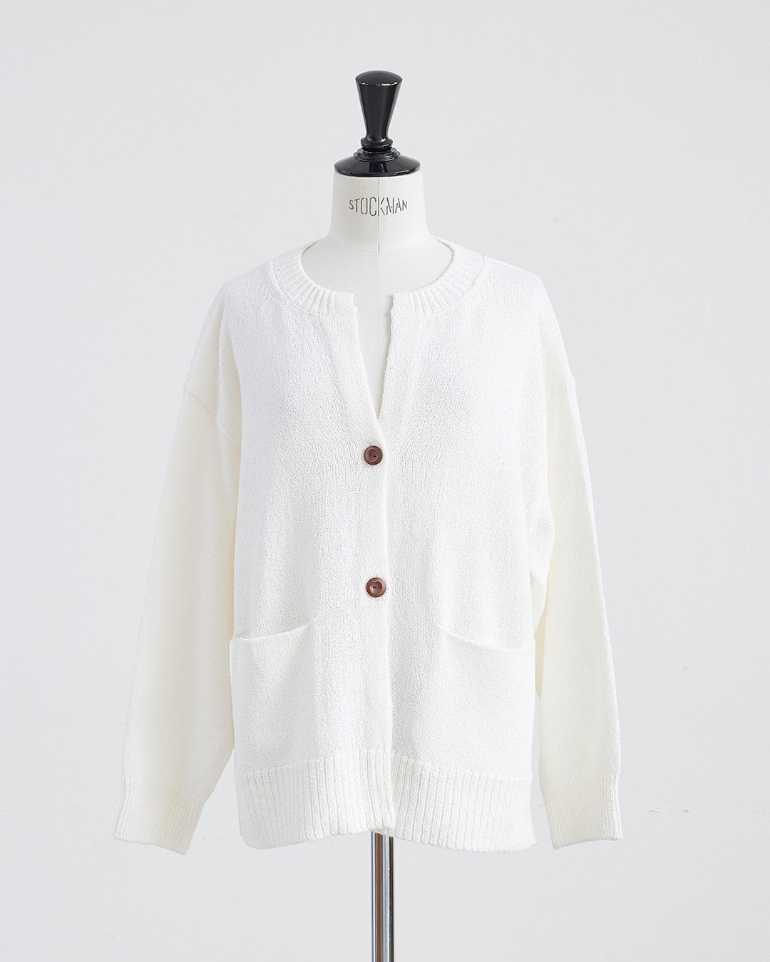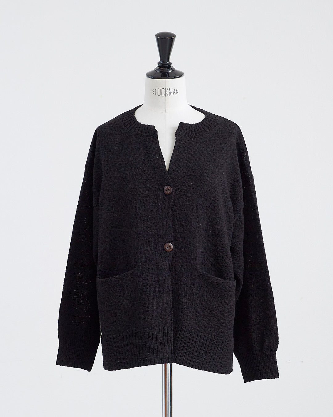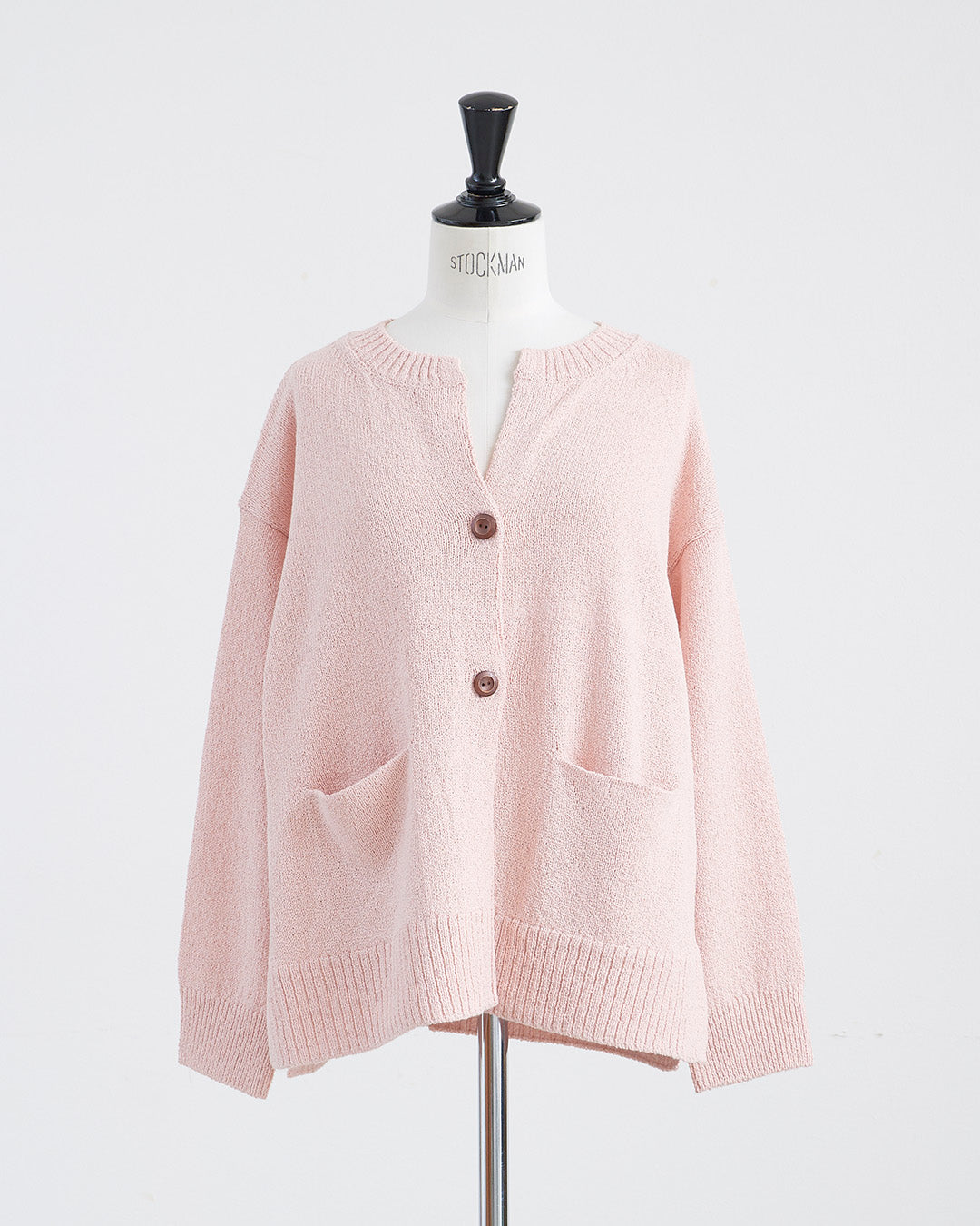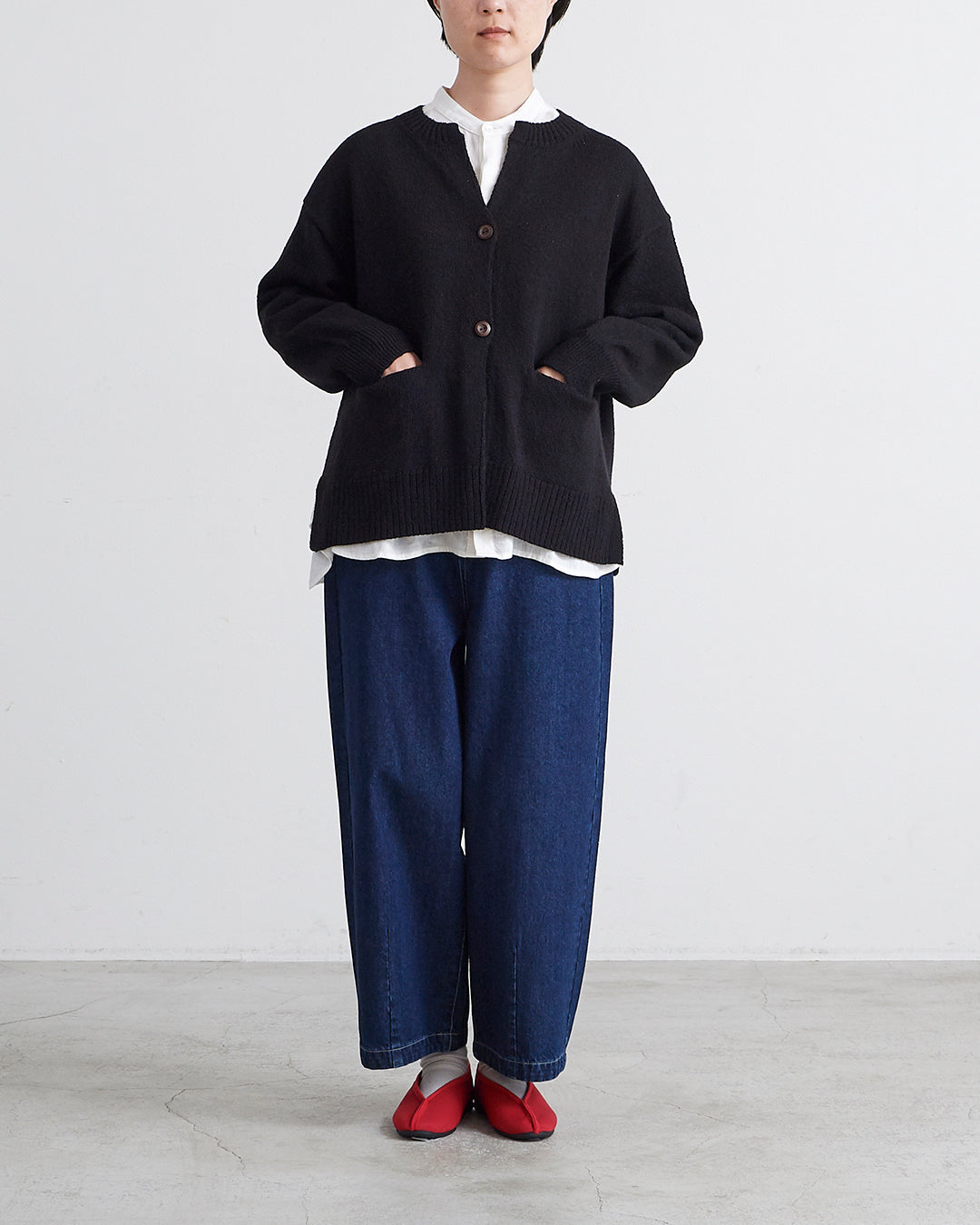 編地に表情のあるショートブークレ糸を使用したカーディガンです 。フロントのウッドボタンがナチュラルなアクセントを添えます 。2ボタン仕様でサッと羽織るだけでこなれ感のあるスタイルが完成 。衿の開きやサイドスリットが抜け感を出し、便利なフロントポケットも付いた実用的な一着です 。