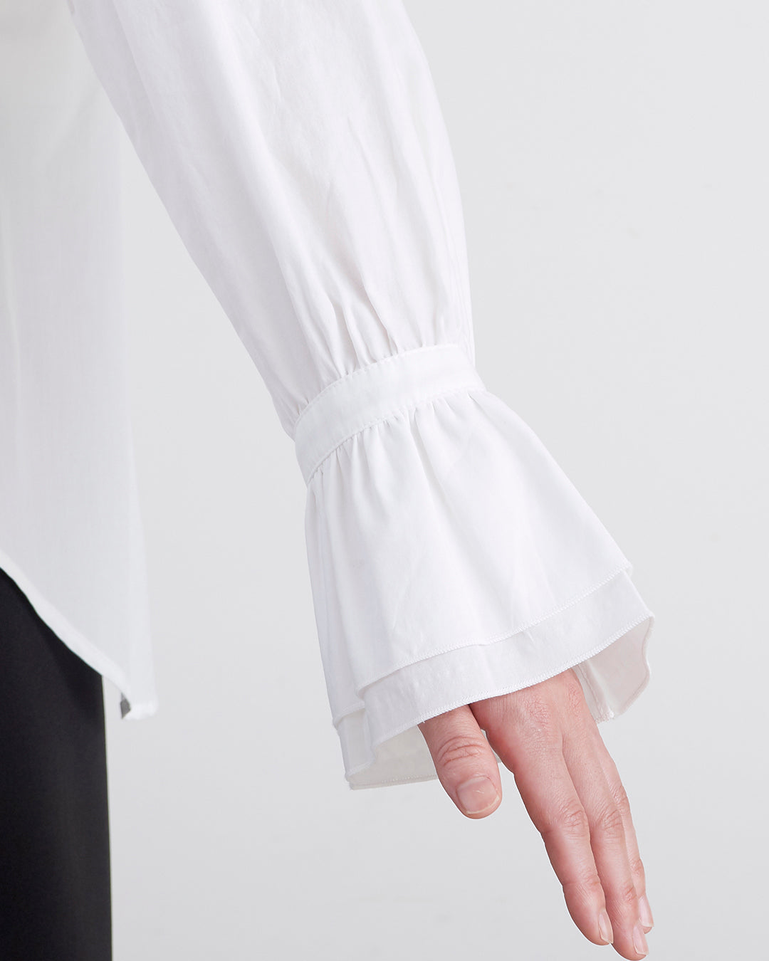 ■ 100双ブロード生地を使用 ■ 手触りが柔らかくしなやかさと上品な光沢があり、高級感のある質感が特徴 ■ 袖のみに微光沢の綿サテンを使用したキャンディースリーブがデザインポイント ■ ジャケットやベストのインナーとしてや、上着の袖口からラッフルを覗かせるコーディネートもおすすめ