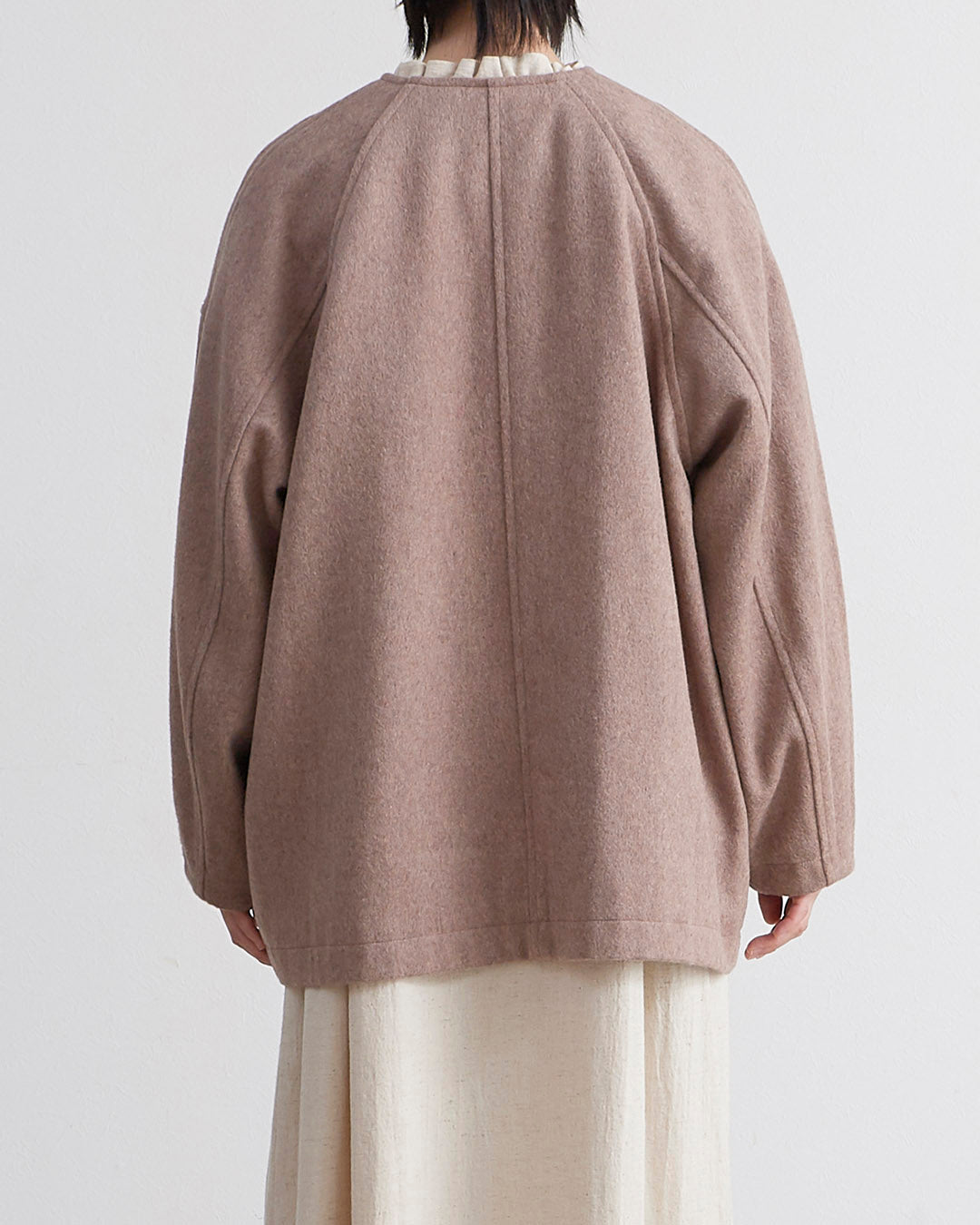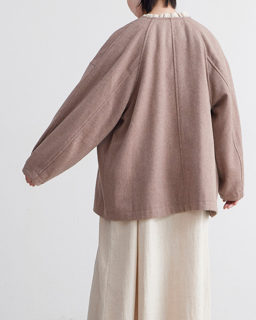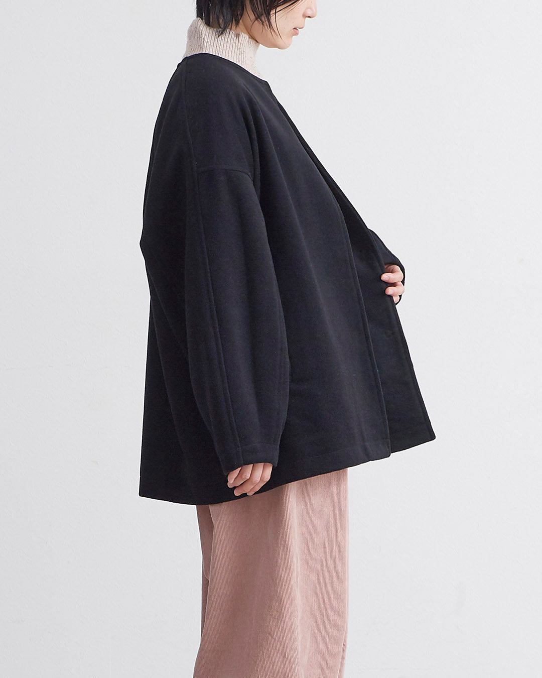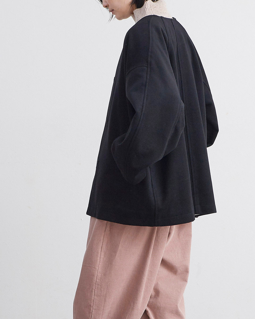 □ウール50%、ポリエステル50%のショートビーバーを使用  □着脱が楽なスナップ釦あき  □肩の動きがスムーズなスプリットラグラン  □コクーンシルエットの袖がポイント  □中に着るインナーを選ばないゆったりしたサイズ感  □裏地付き