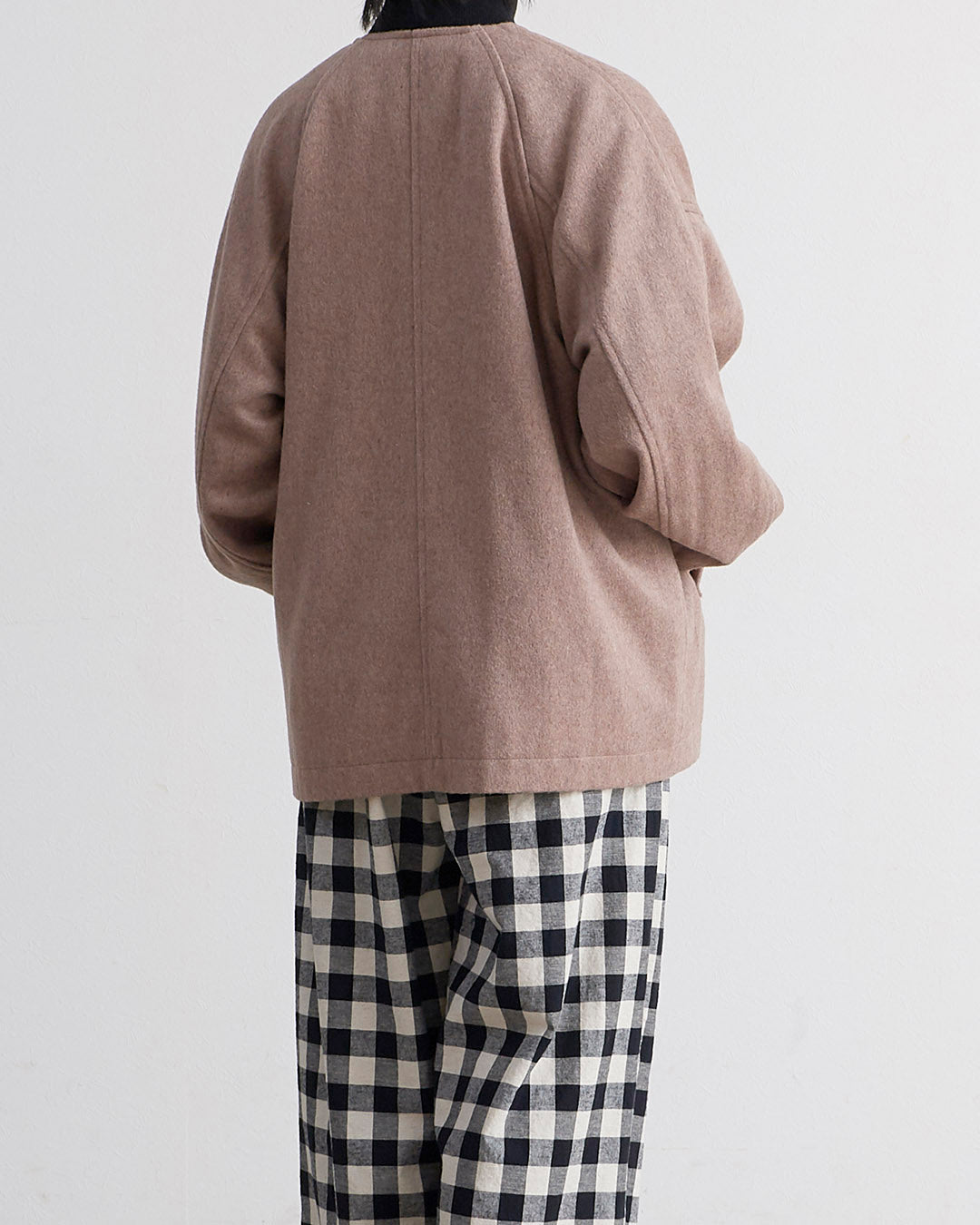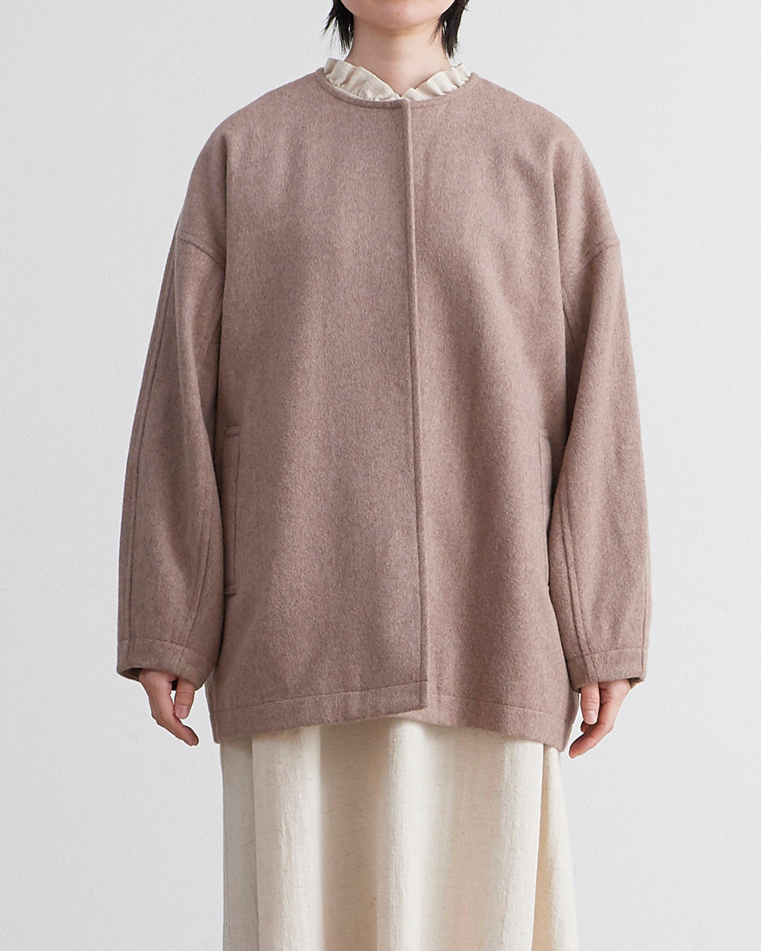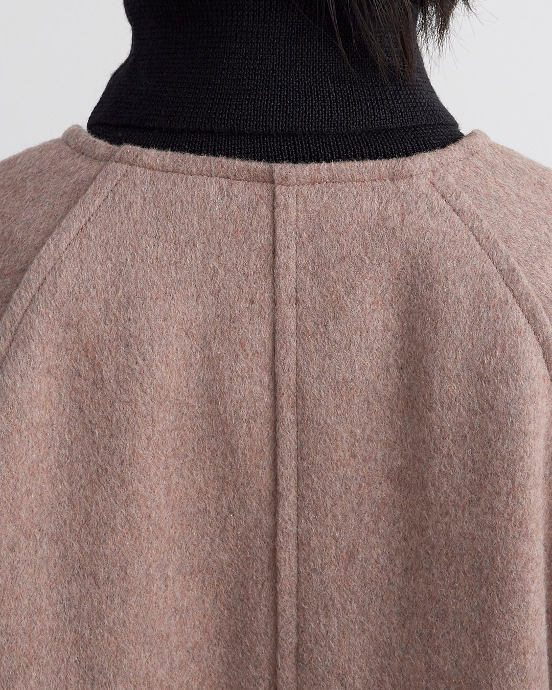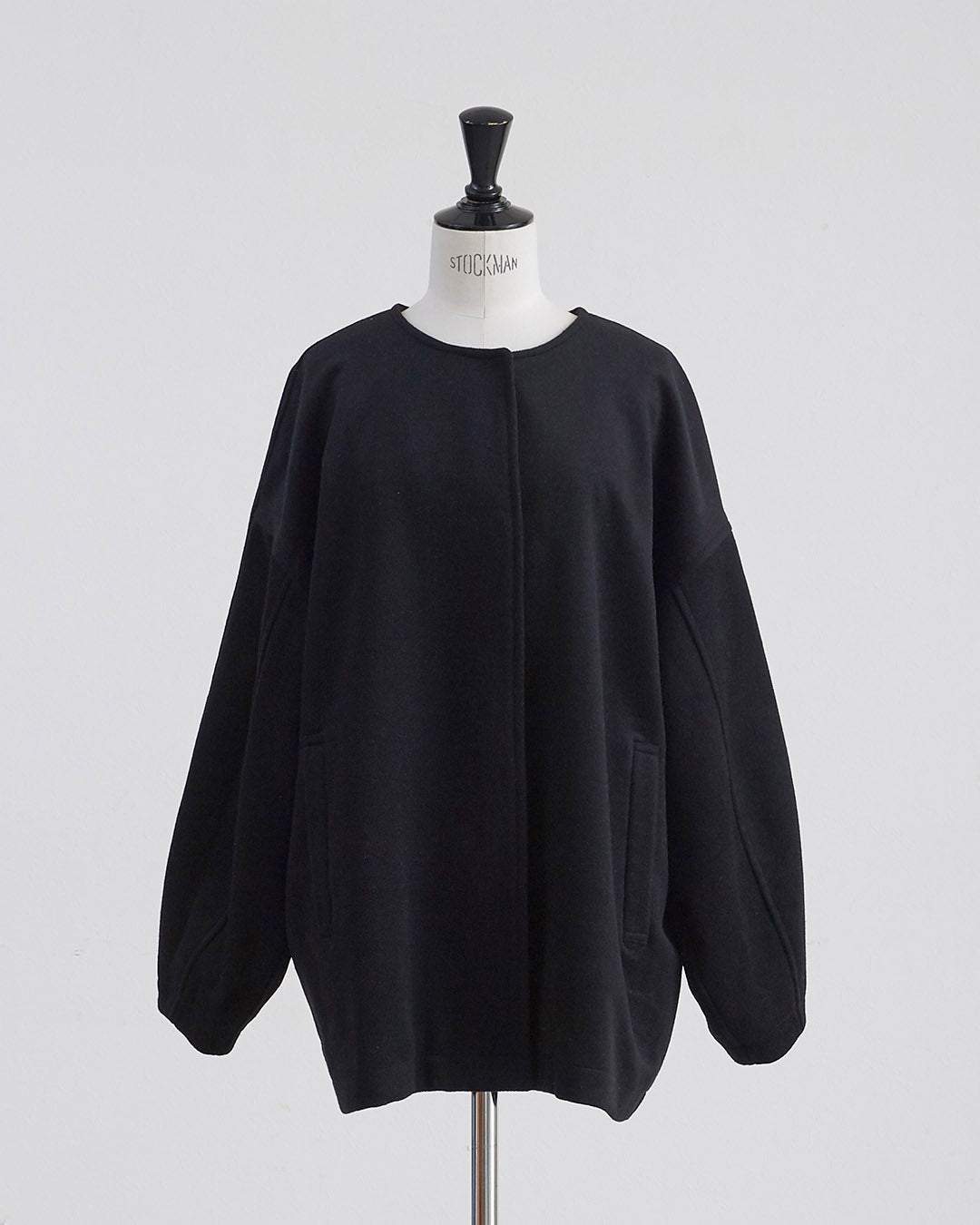 □ウール50%、ポリエステル50%のショートビーバーを使用  □着脱が楽なスナップ釦あき  □肩の動きがスムーズなスプリットラグラン  □コクーンシルエットの袖がポイント  □中に着るインナーを選ばないゆったりしたサイズ感  □裏地付き