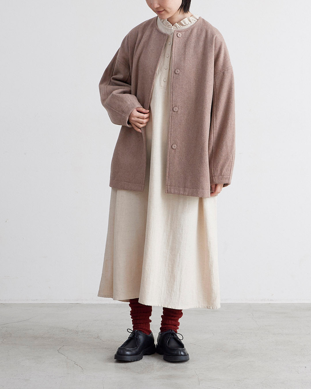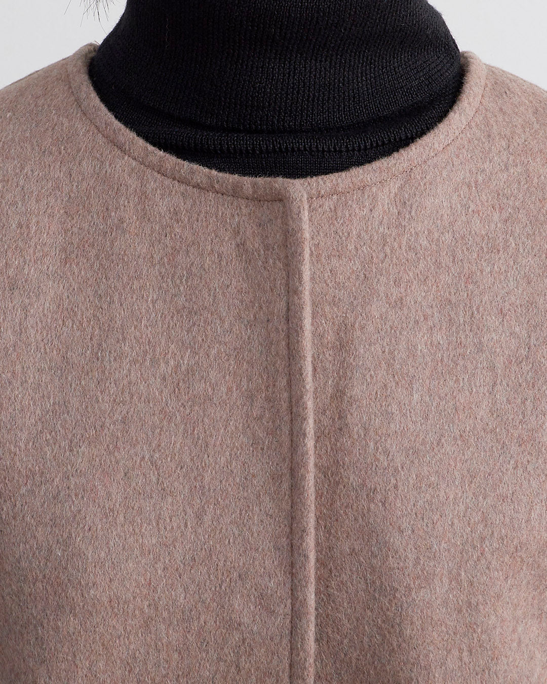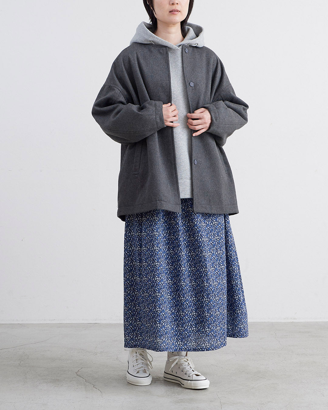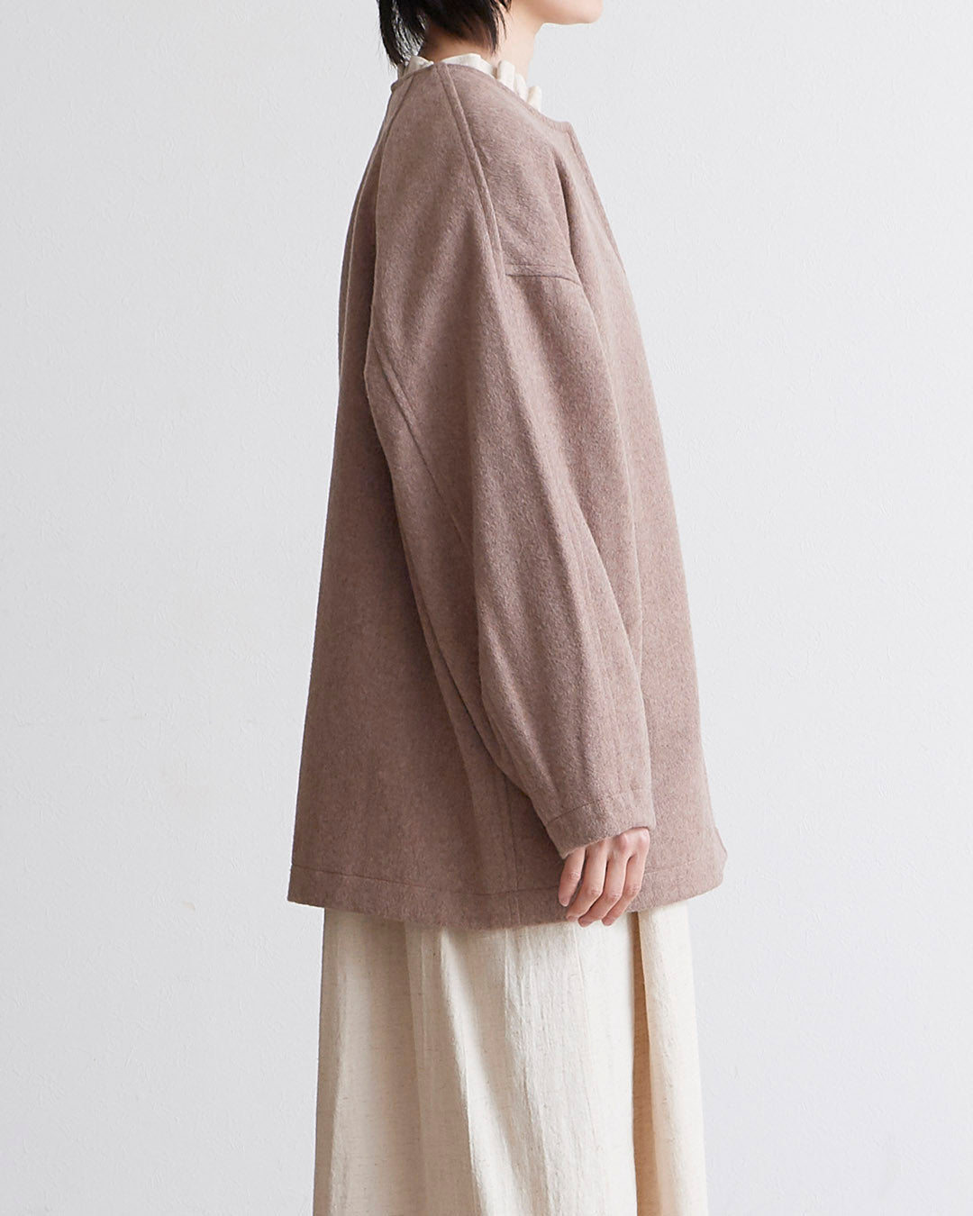 □ウール50%、ポリエステル50%のショートビーバーを使用  □着脱が楽なスナップ釦あき  □肩の動きがスムーズなスプリットラグラン  □コクーンシルエットの袖がポイント  □中に着るインナーを選ばないゆったりしたサイズ感  □裏地付き