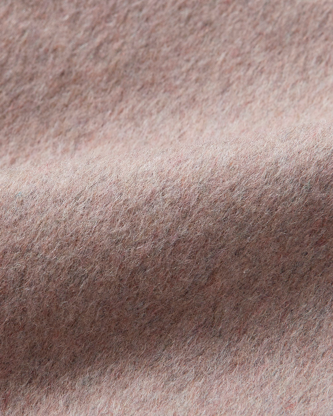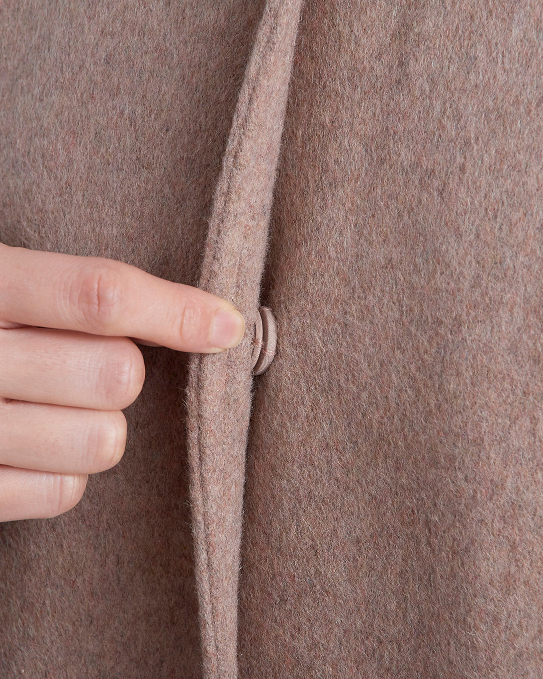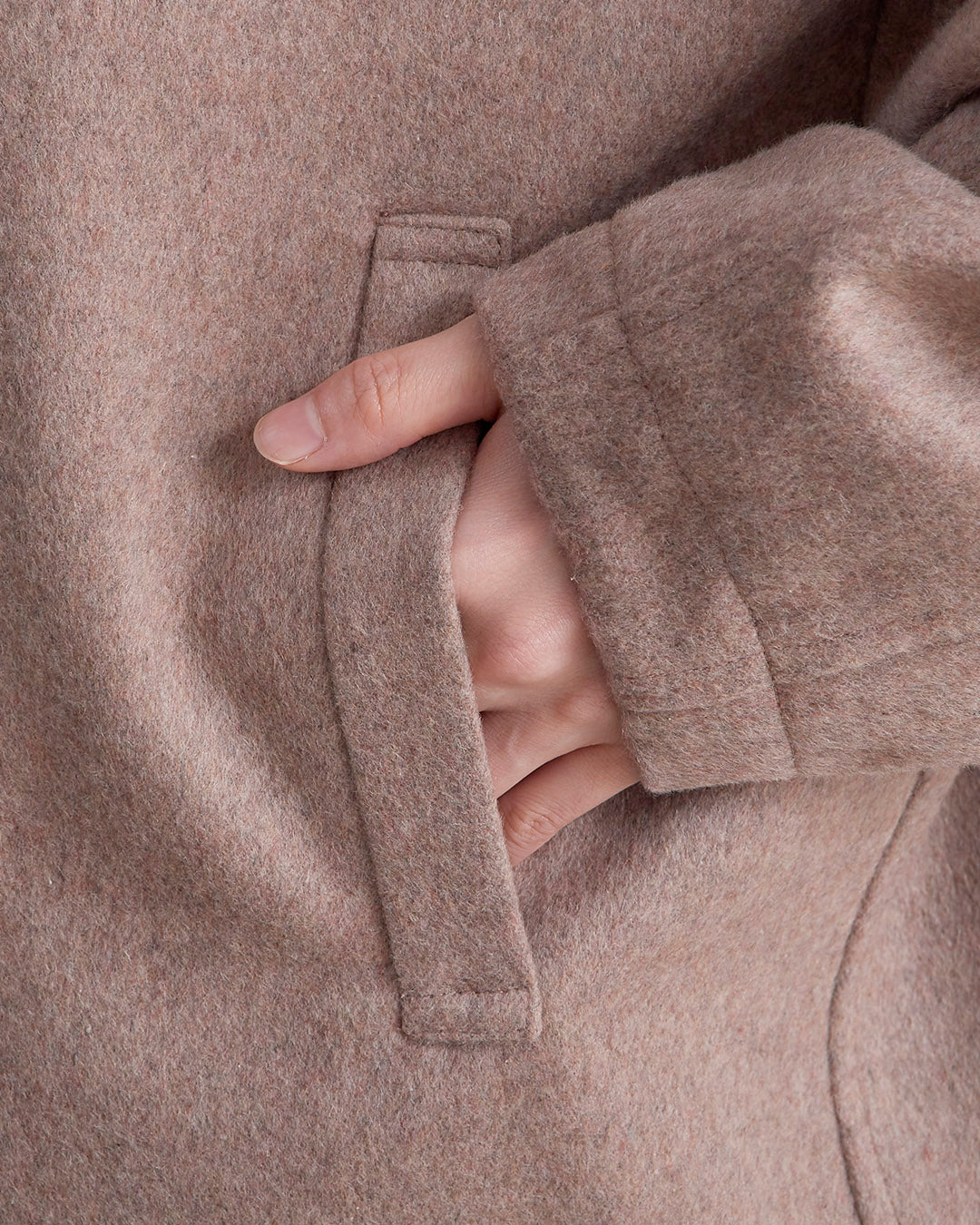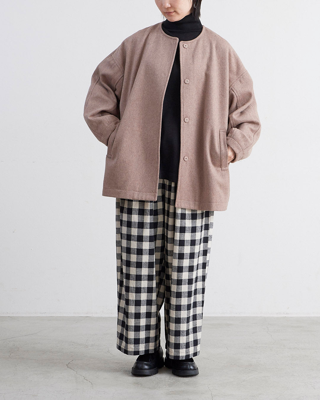 □ウール50%、ポリエステル50%のショートビーバーを使用  □着脱が楽なスナップ釦あき  □肩の動きがスムーズなスプリットラグラン  □コクーンシルエットの袖がポイント  □中に着るインナーを選ばないゆったりしたサイズ感  □裏地付き