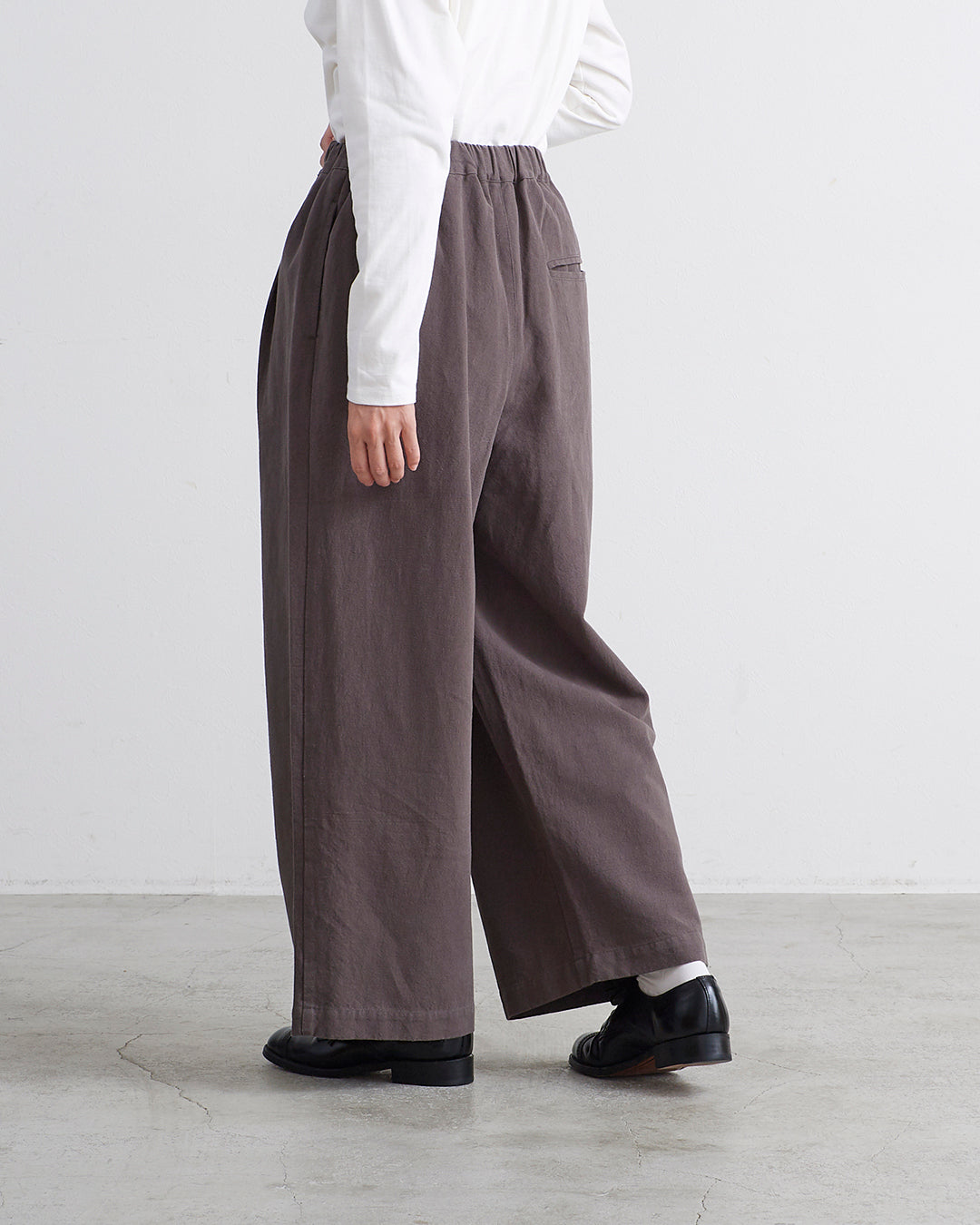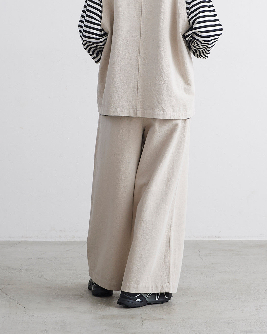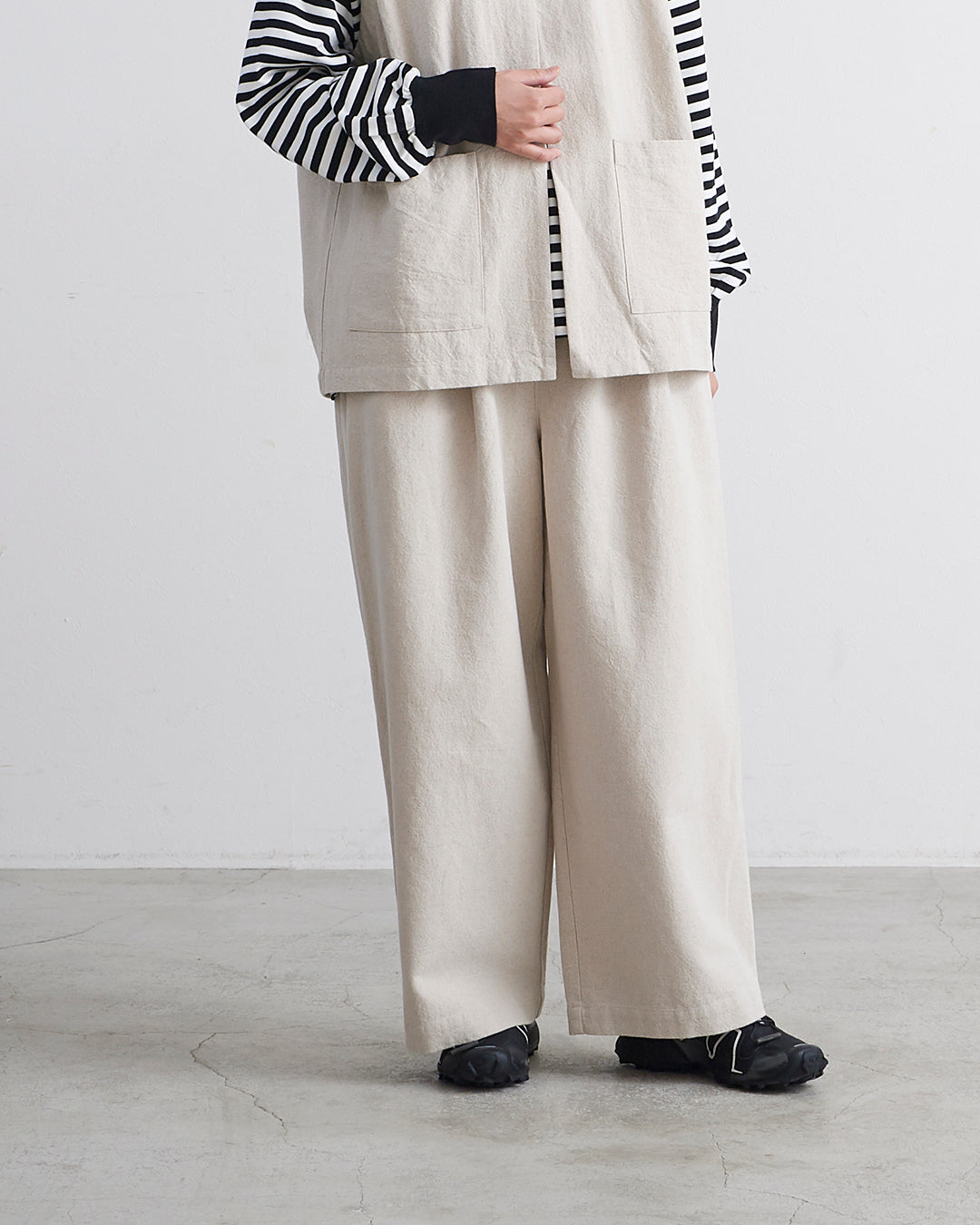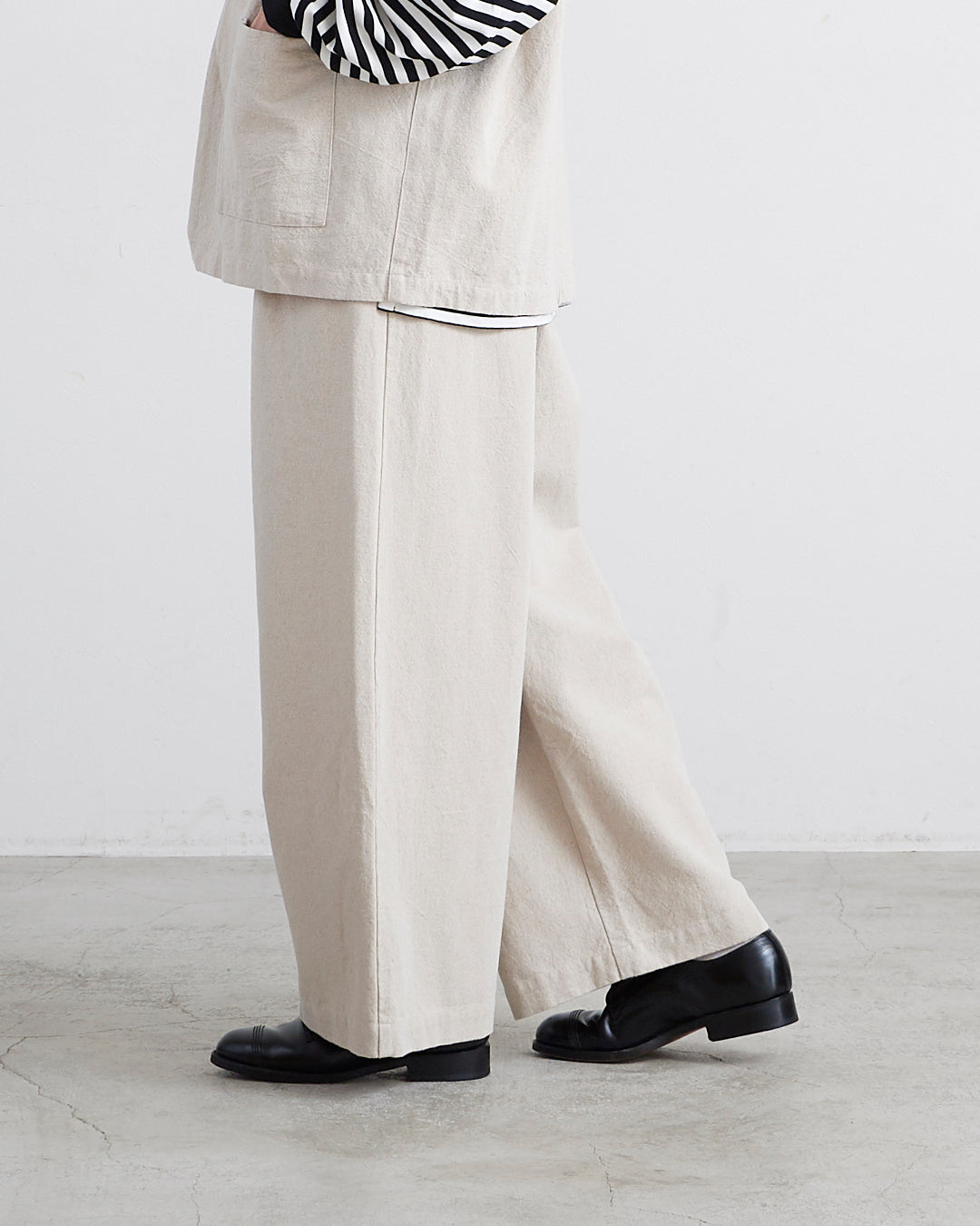程よく厚みのある綿麻キャンバス地を使用した、ストレートシルエットのワイドパンツです 。リネン混の柔らかな風合いで穿き心地も抜群 。ウエストにはタックを施し、後ろはゴム仕様にすることで、トップスをインしたスタイルも綺麗に見せてくれます 。デイリーに使いやすい頼れる一本です。