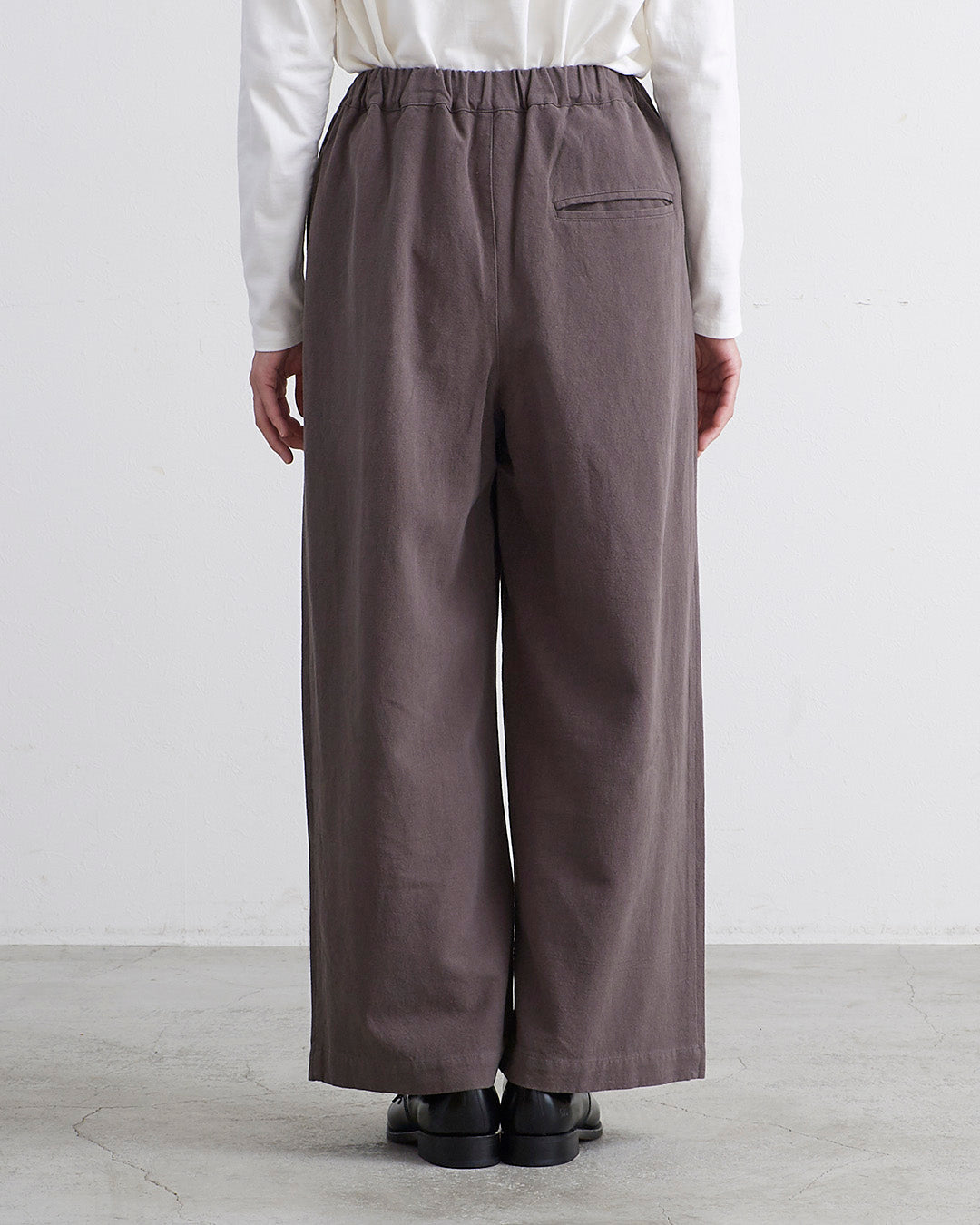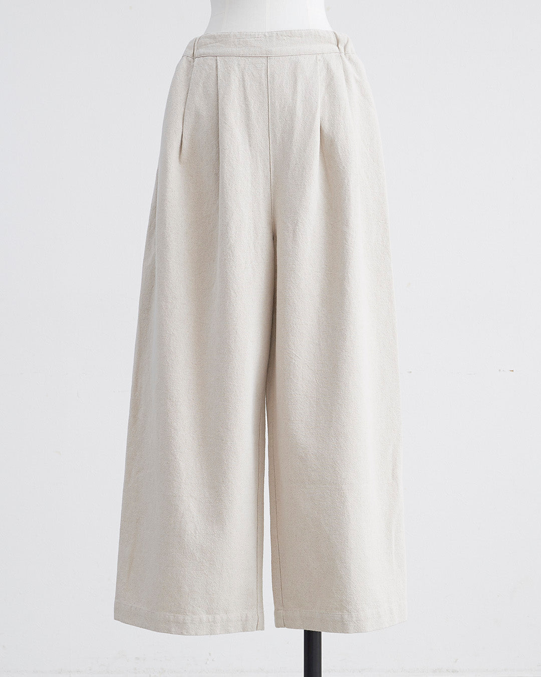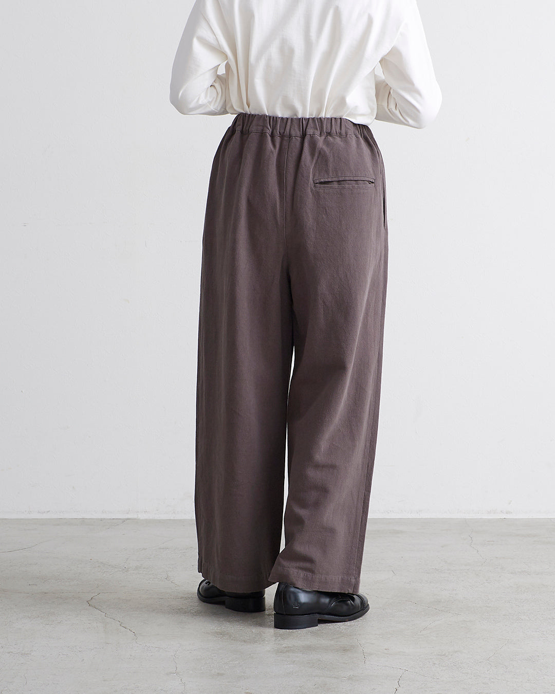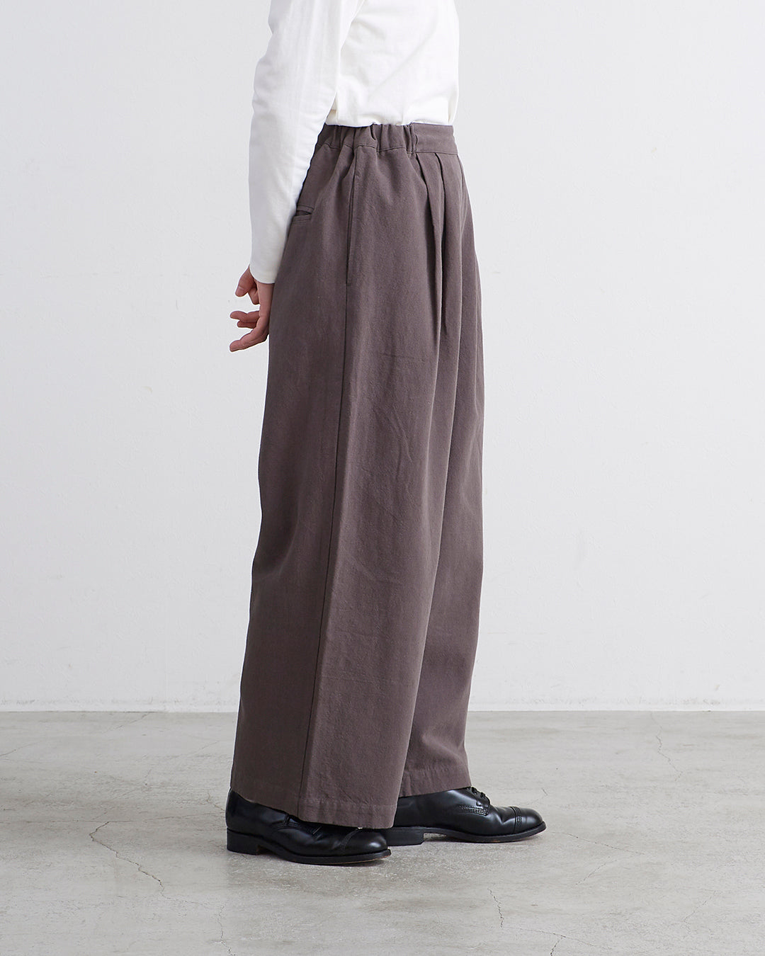 程よく厚みのある綿麻キャンバス地を使用した、ストレートシルエットのワイドパンツです 。リネン混の柔らかな風合いで穿き心地も抜群 。ウエストにはタックを施し、後ろはゴム仕様にすることで、トップスをインしたスタイルも綺麗に見せてくれます 。デイリーに使いやすい頼れる一本です。
