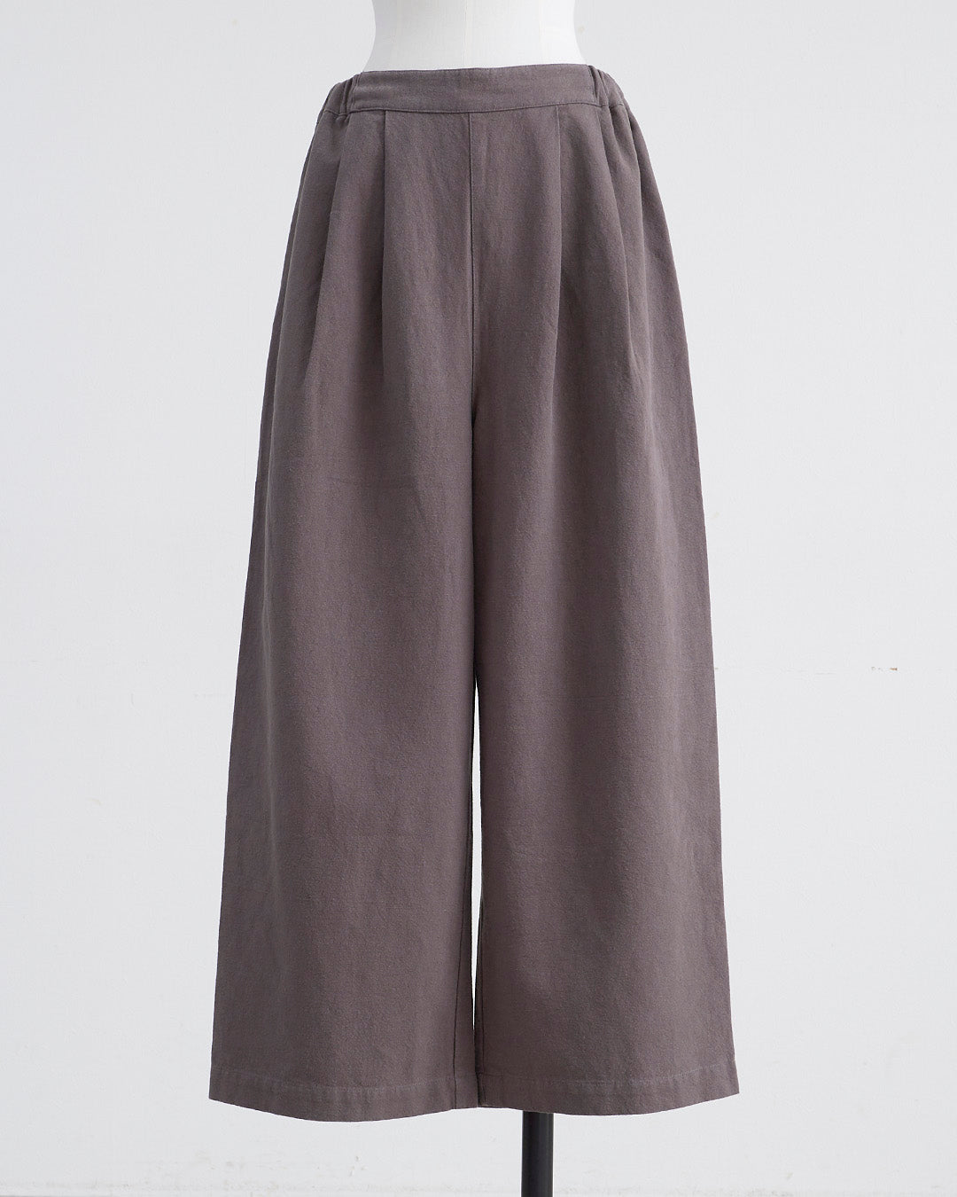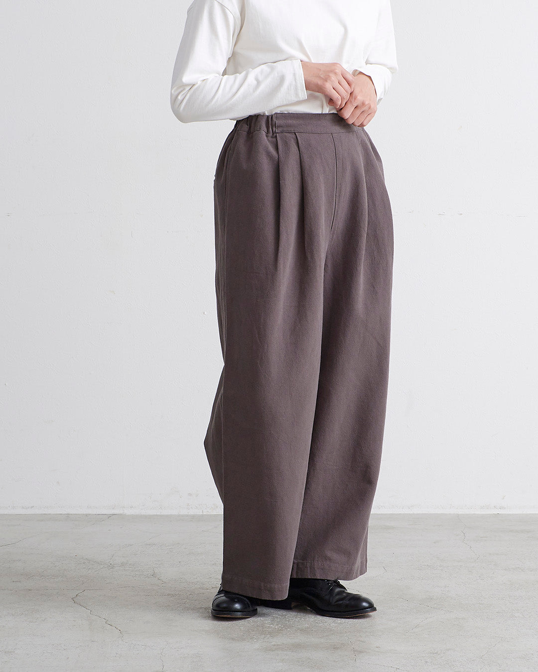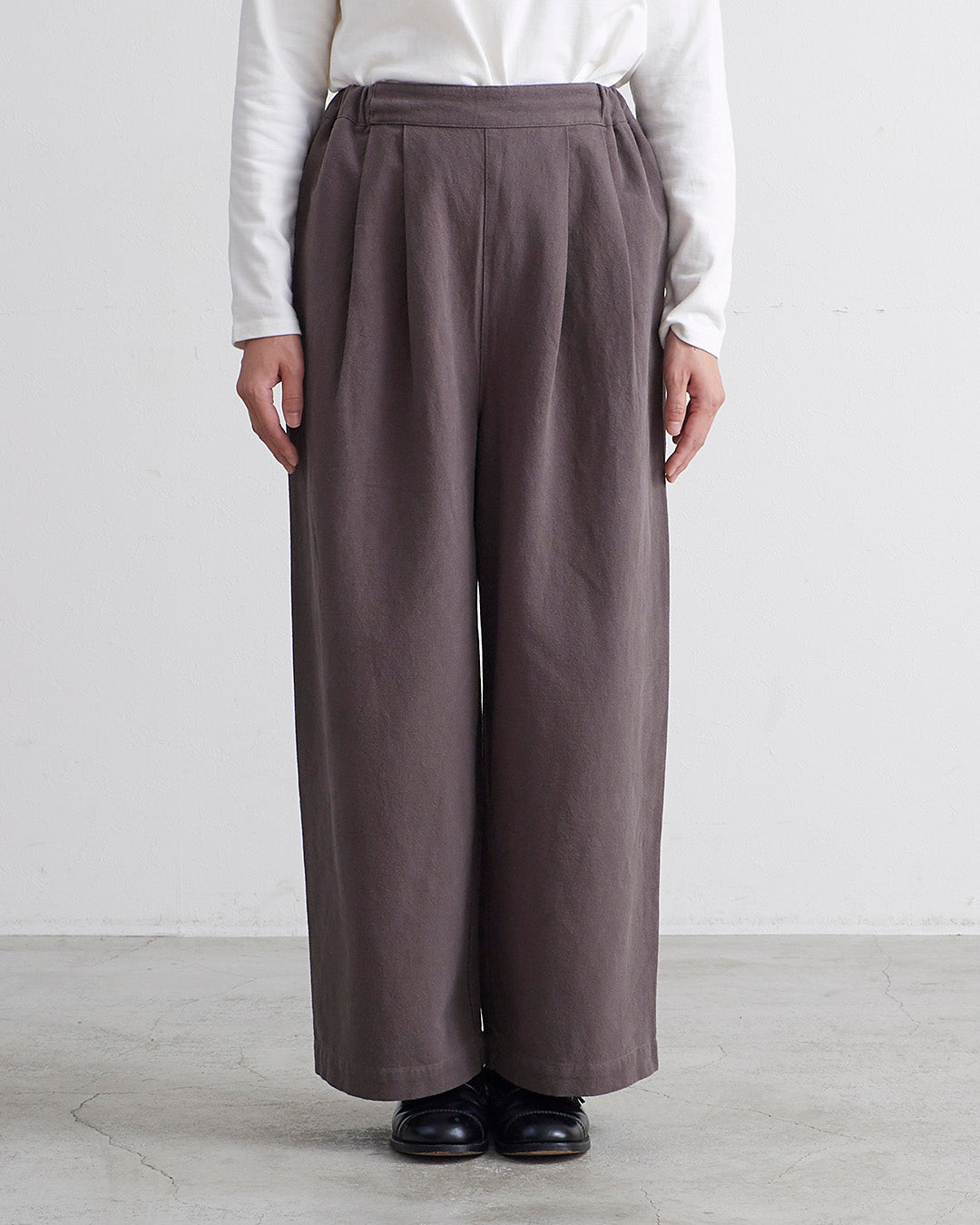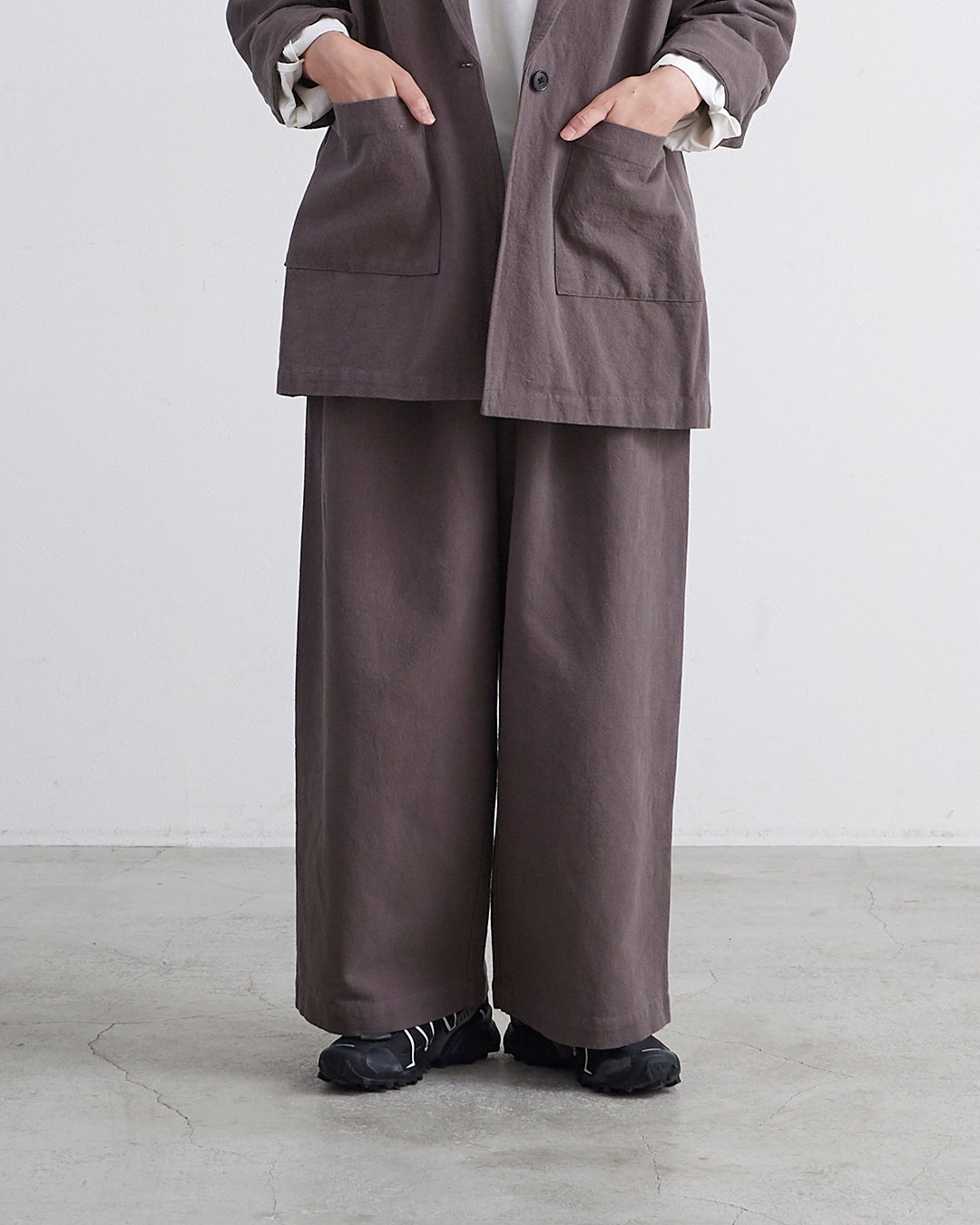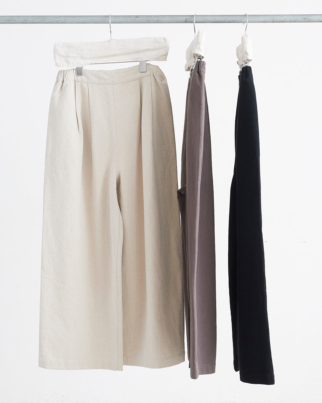 程よく厚みのある綿麻キャンバス地を使用した、ストレートシルエットのワイドパンツです 。リネン混の柔らかな風合いで穿き心地も抜群 。ウエストにはタックを施し、後ろはゴム仕様にすることで、トップスをインしたスタイルも綺麗に見せてくれます 。デイリーに使いやすい頼れる一本です。