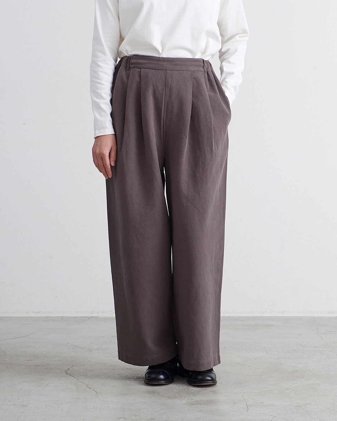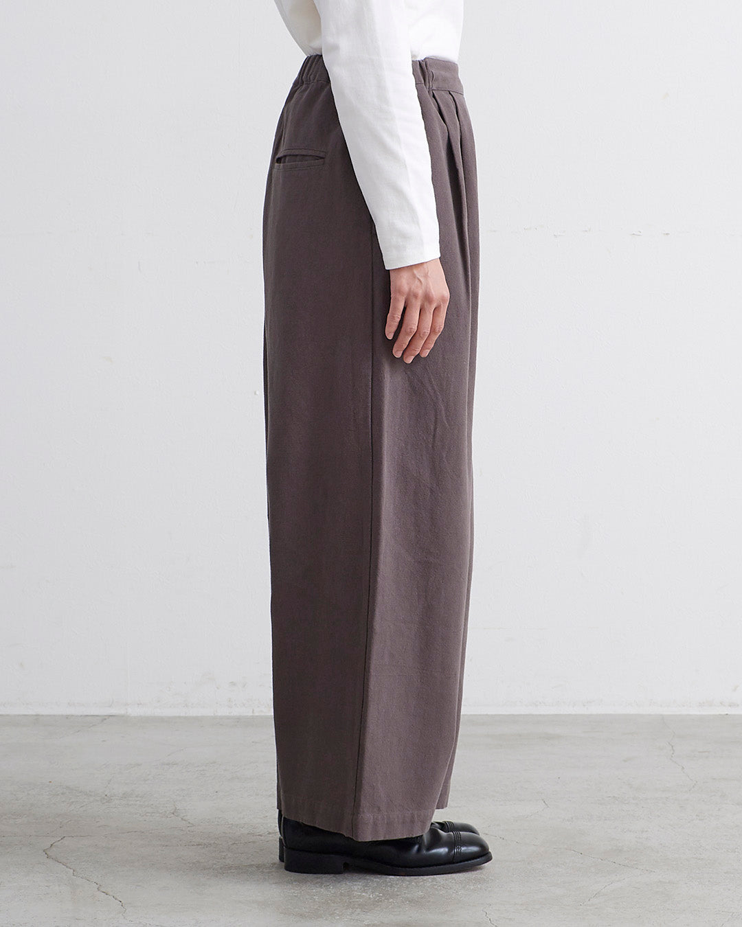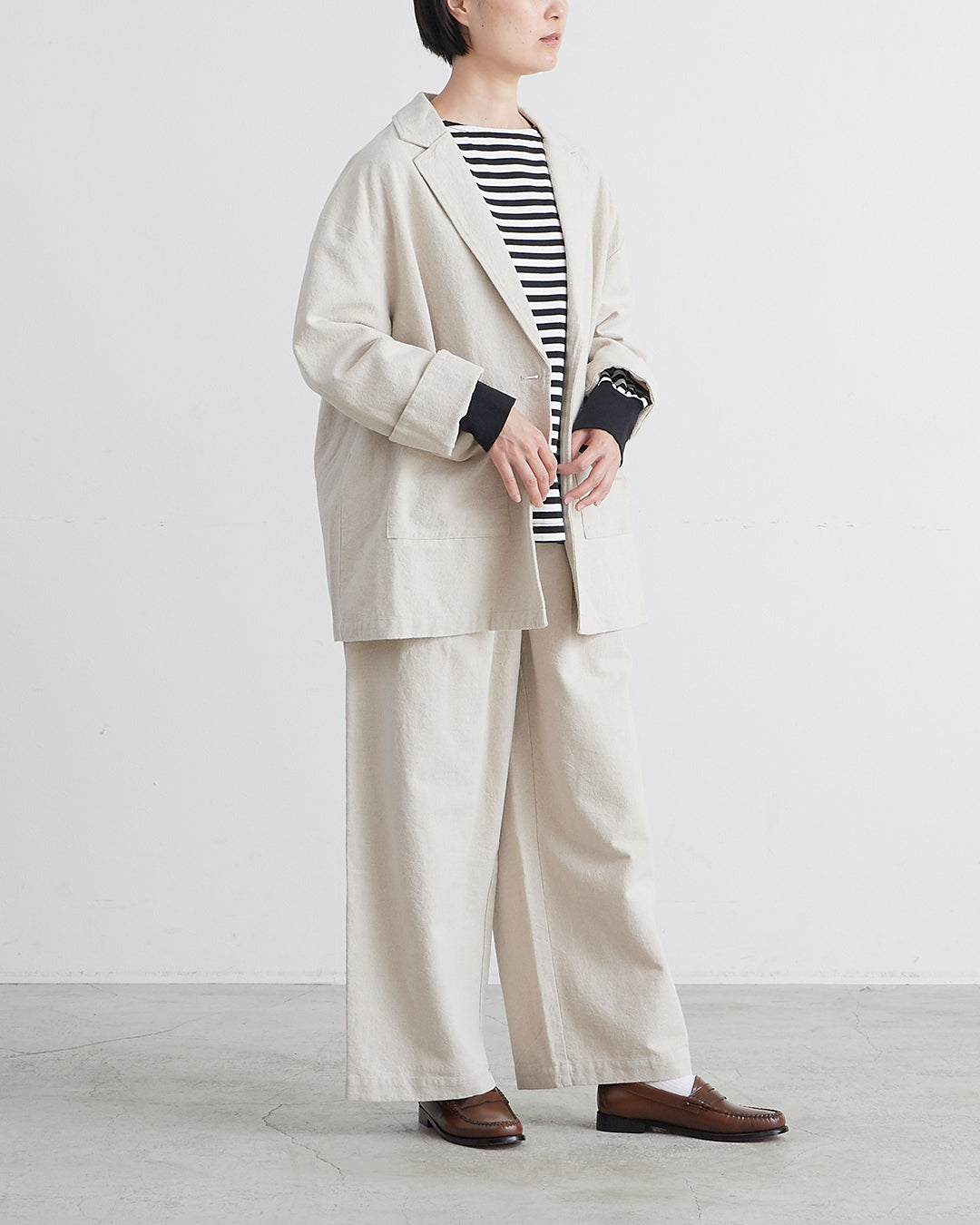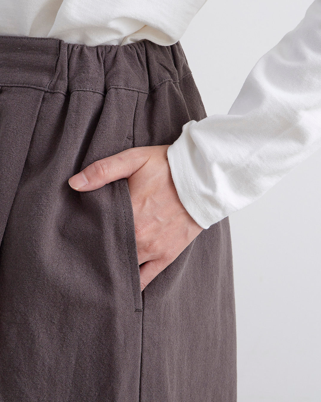 程よく厚みのある綿麻キャンバス地を使用した、ストレートシルエットのワイドパンツです 。リネン混の柔らかな風合いで穿き心地も抜群 。ウエストにはタックを施し、後ろはゴム仕様にすることで、トップスをインしたスタイルも綺麗に見せてくれます 。デイリーに使いやすい頼れる一本です。