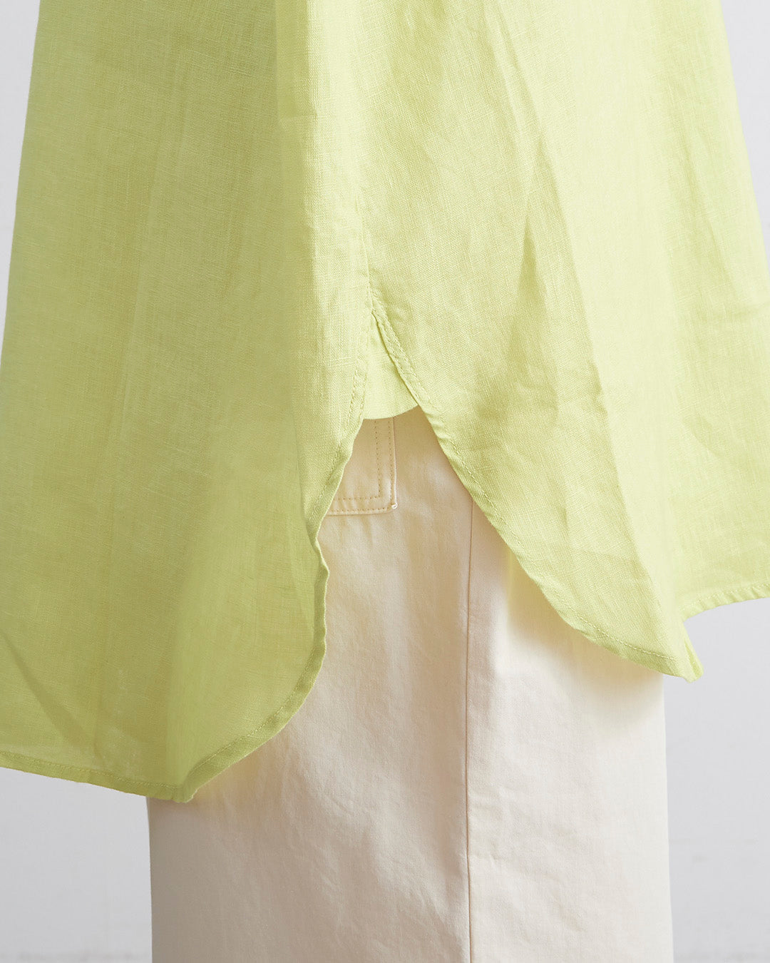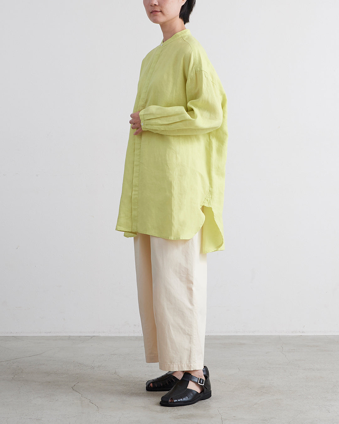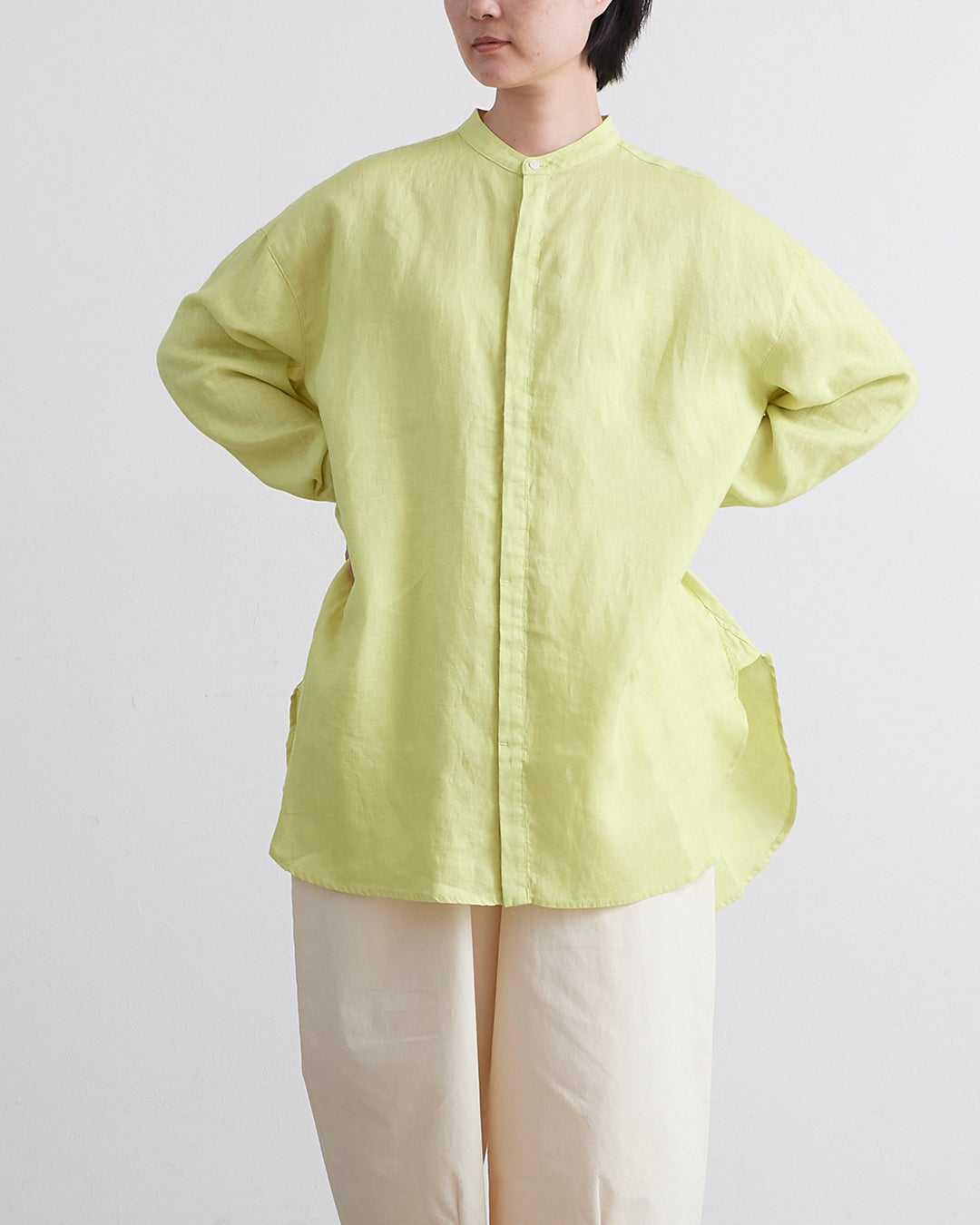 □素 材 麻:100%□生産国 中国□サイズ 着丈:81/84㎝ , 肩幅:58㎝ , 袖丈:46㎝ , 身幅:66㎝ , アームホール:21㎝ , 裾幅:68㎝
